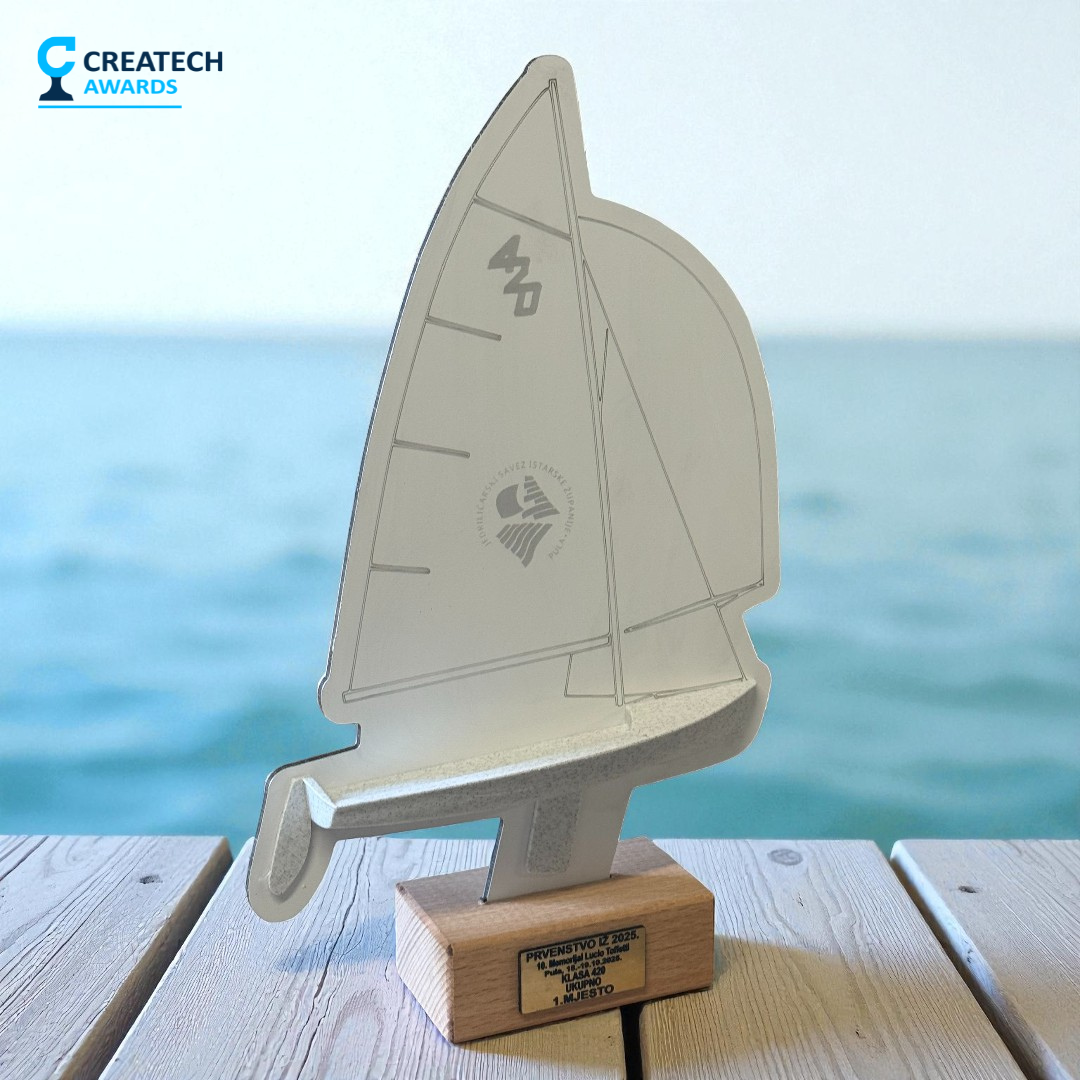 Pehari za jedriličarske regate u klasi 420, izrađeni od kombinacije drveta i aluminija. Svaki pehar ima drvenu osnovu i aluminijski element u obliku jedra. Mogućnost personalizacije gravurom.